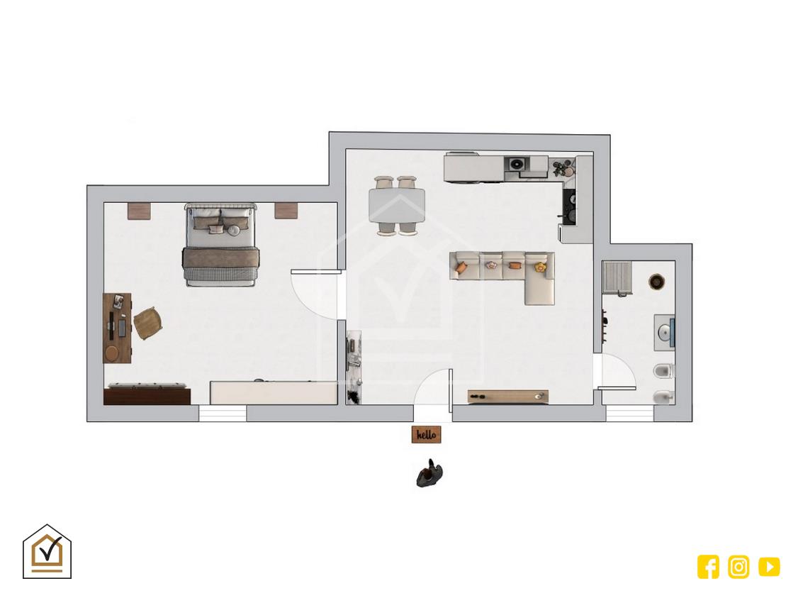 L’appartamento si compone di due ambienti ben distribuiti, con una zona giorno accogliente, una camera da letto comoda e un bagno funzionale. Gli spazi, seppur contenuti, sono ben sfruttati e l’atmosfera generale è piacevole e riservata.