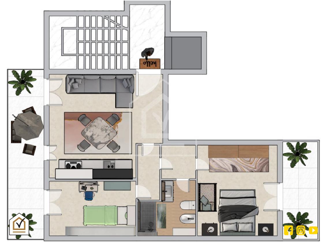 L’ingresso si apre su una luminosa zona living con cucina a vista, ben distribuita e accogliente, che si affaccia su due ampi balconi vivibili, perfetti per colazioni all’aperto, momenti di relax o come estensione naturale della zona giorno.