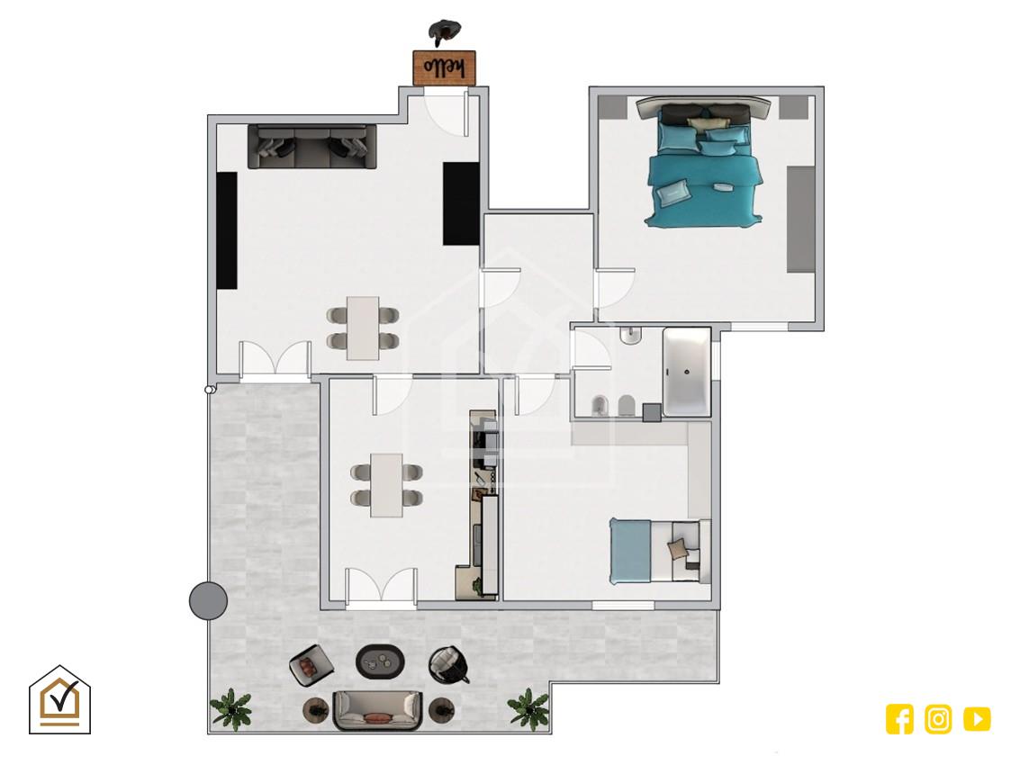 L’appartamento si apre su un accogliente salone che regala l’accesso al meraviglioso balcone terrazzato, spazio esterno ideale per vivere momenti di convivialità e relax. La cucina, ampia e abitabile, anch’essa con sbocco sul terrazzo, permette di unire praticità e funzionalità agli ambienti della zona giorno.