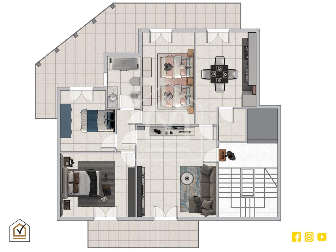 Un disimpegno centrale divide la zona giorno da quella notte, garantendo comfort e riservatezza. Qui si trovano tre camere da letto, tutte caratterizzate da ottima luminosità e da accesso al balcone, che donano ariosità e continuità tra spazi interni ed esterni. Completa la zona notte il bagno padronale, finestrato e funzionale.