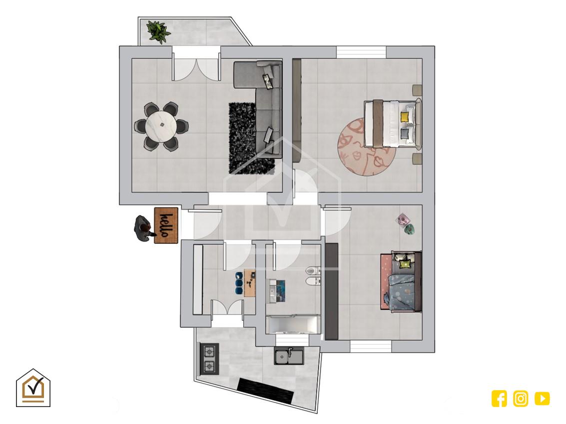 Internamente propone una zona giorno composta da un ampio salone con accesso al balcone esterno ed una sala da pranzo con esposizione sul balcone verandato ove è presente l'angolo cottura. La zona notte possiede due camere da letto di comoda metratura, un utile ripostiglio ed il bagno finestrato.