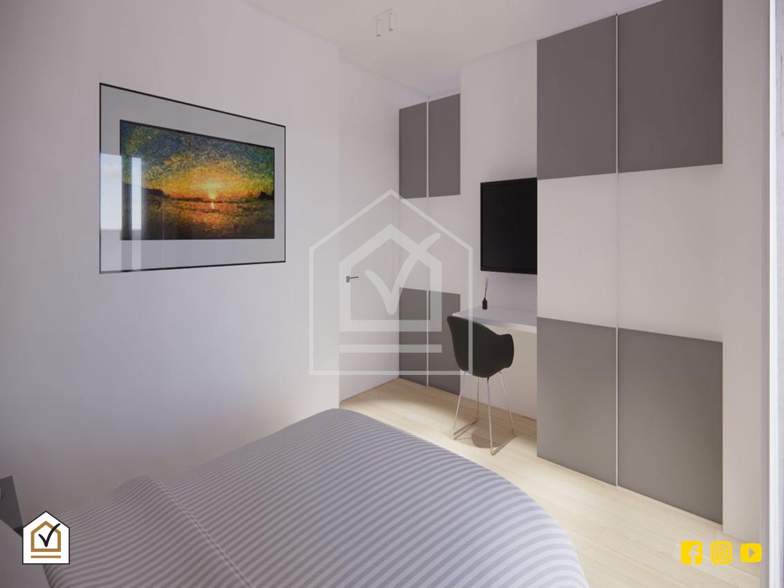 Alla destra dell’ingresso, un pratico disimpegno conduce alla zona notte, composta da un bagno curato nei dettagli e da una spaziosa camera da letto con accesso a un secondo balcone. Quest’ultimo ospita un vano tecnico e una zona lavanderia, soluzioni pratiche che uniscono funzionalità ed estetica.