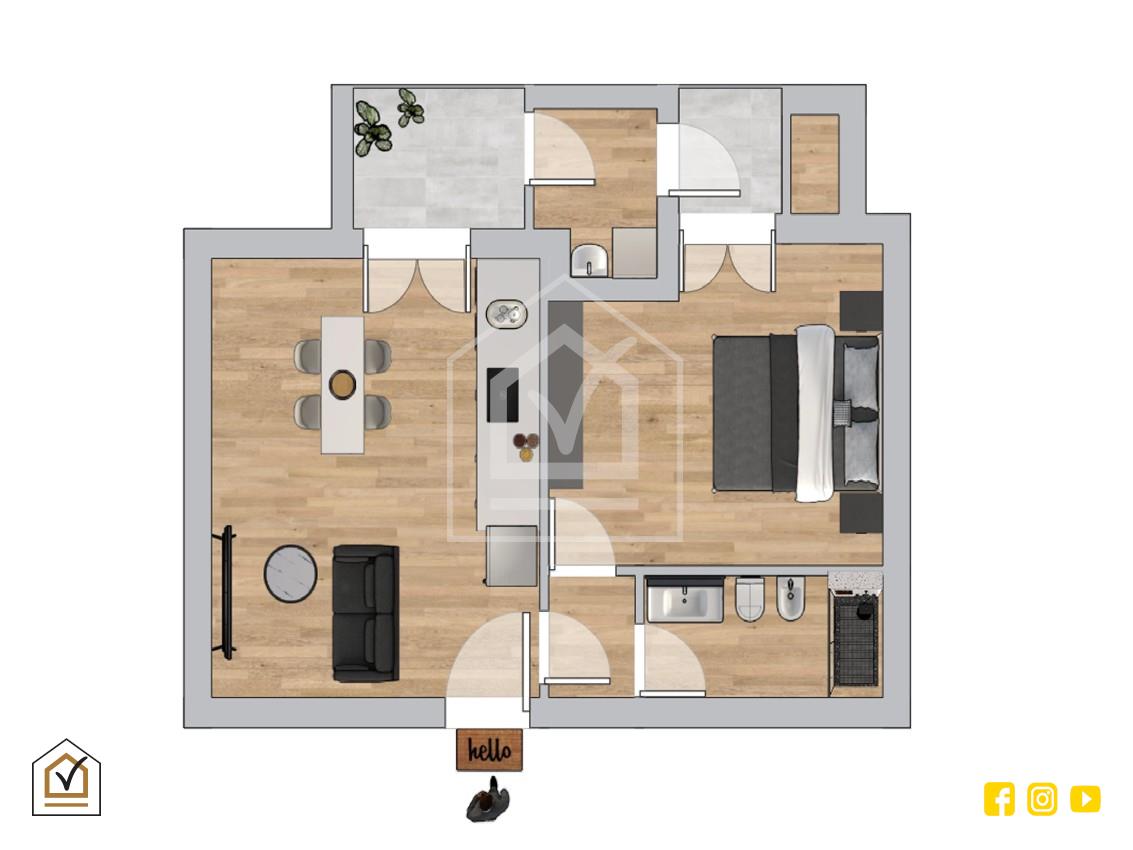 L’abitazione si distingue per una distribuzione moderna e funzionale degli spazi. L’ingresso si apre su un ampio ambiente open-space che integra in modo armonioso soggiorno e cucina, con accesso diretto a un comodo balcone che amplia la vivibilità della zona giorno.