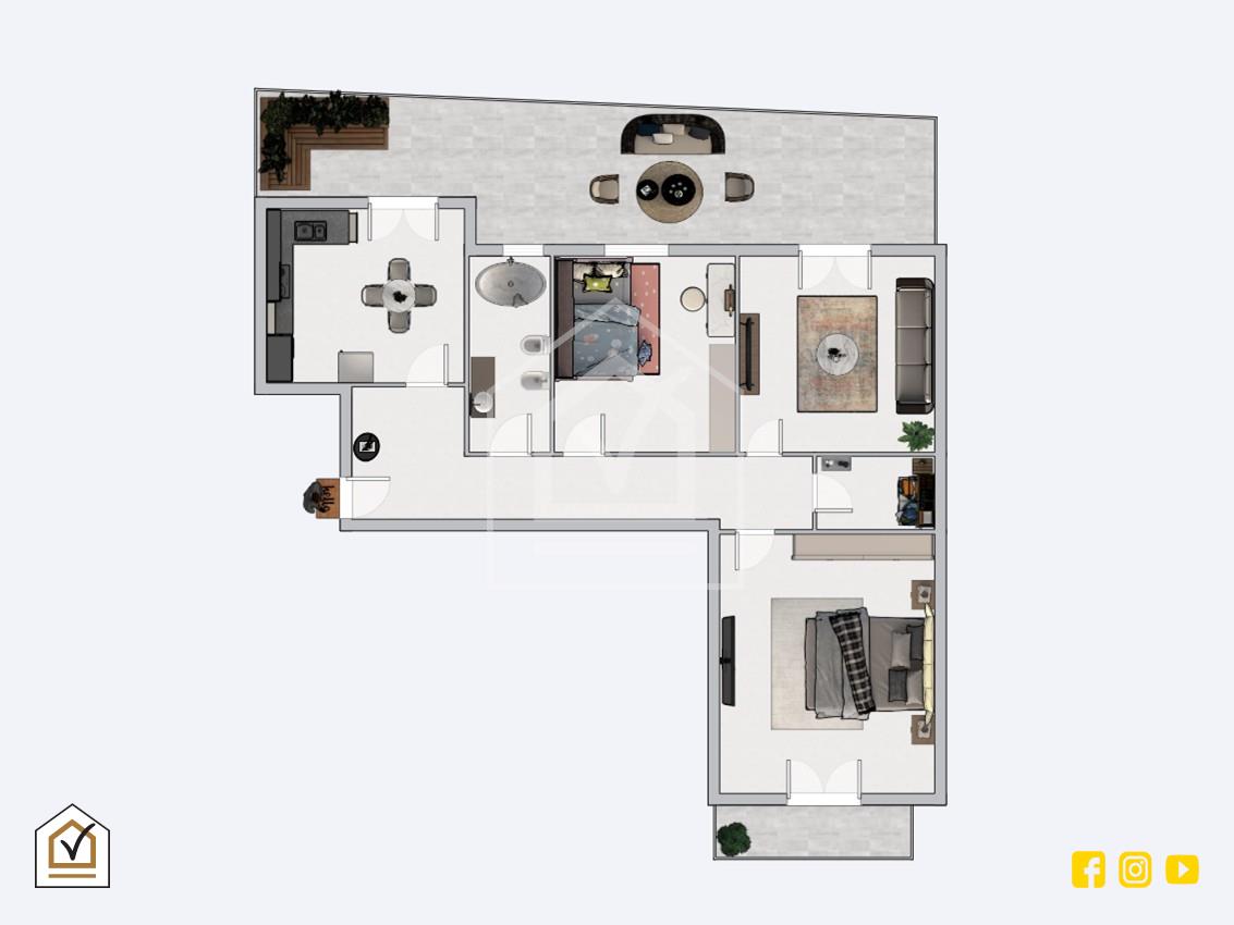 L’ingresso introduce in un comodo disimpegno che conduce ai vari ambienti della casa. Dalla cucina abitabile si potrà accedere al balcone terrazzato; il salone, ampio e comodo, dispone anch'esso di accesso al balcone. La zona notte comprende due confortevoli camere da letto, di cui una con accesso diretto sul balcone ed infine bagno finestrato e utile ripostiglio.