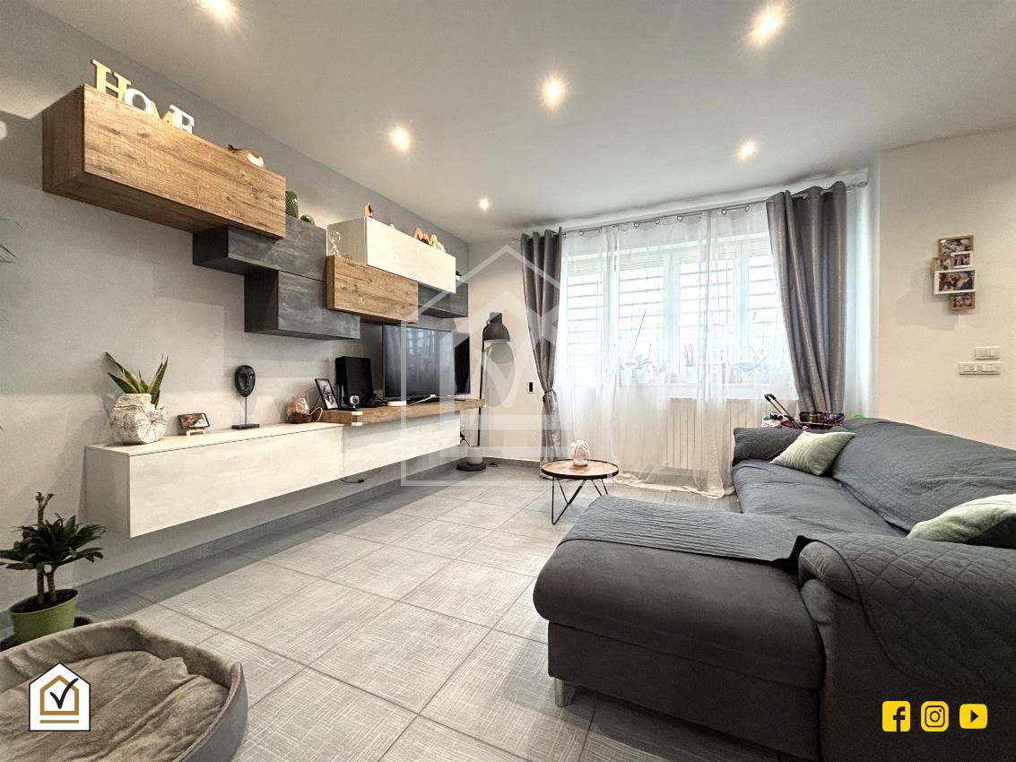 La tavernetta rappresenta un vero valore aggiunto: vi si accede sia dall’interno sia tramite ingresso indipendente con doppia vetrata scorrevole in PVC, che la rende luminosa e perfetta anche come spazio per ospiti o come ambiente ricreativo. La pavimentazione in gres effetto pietra e la controsoffittatura con faretti a LED creano un ambiente caldo e accogliente, completo di angolo cottura, area living e bagno.