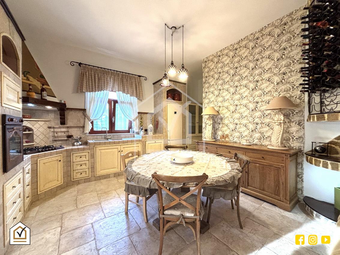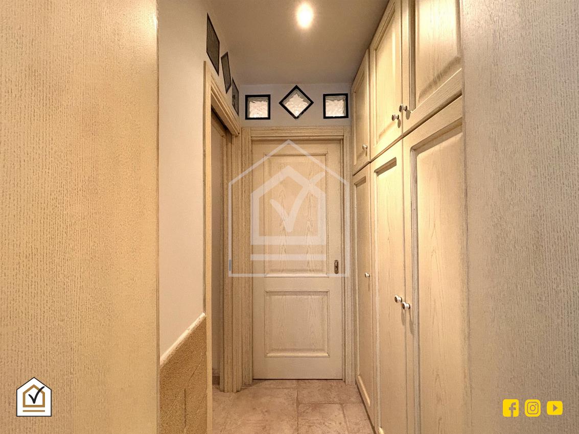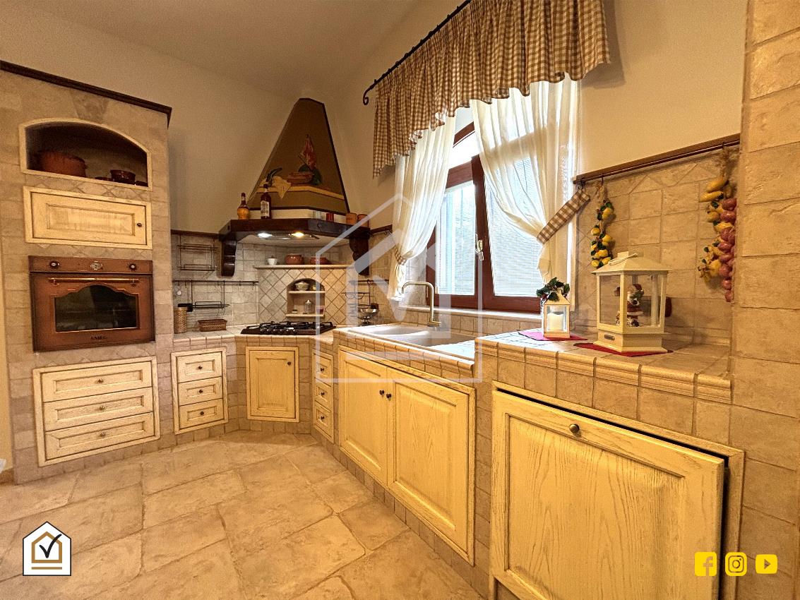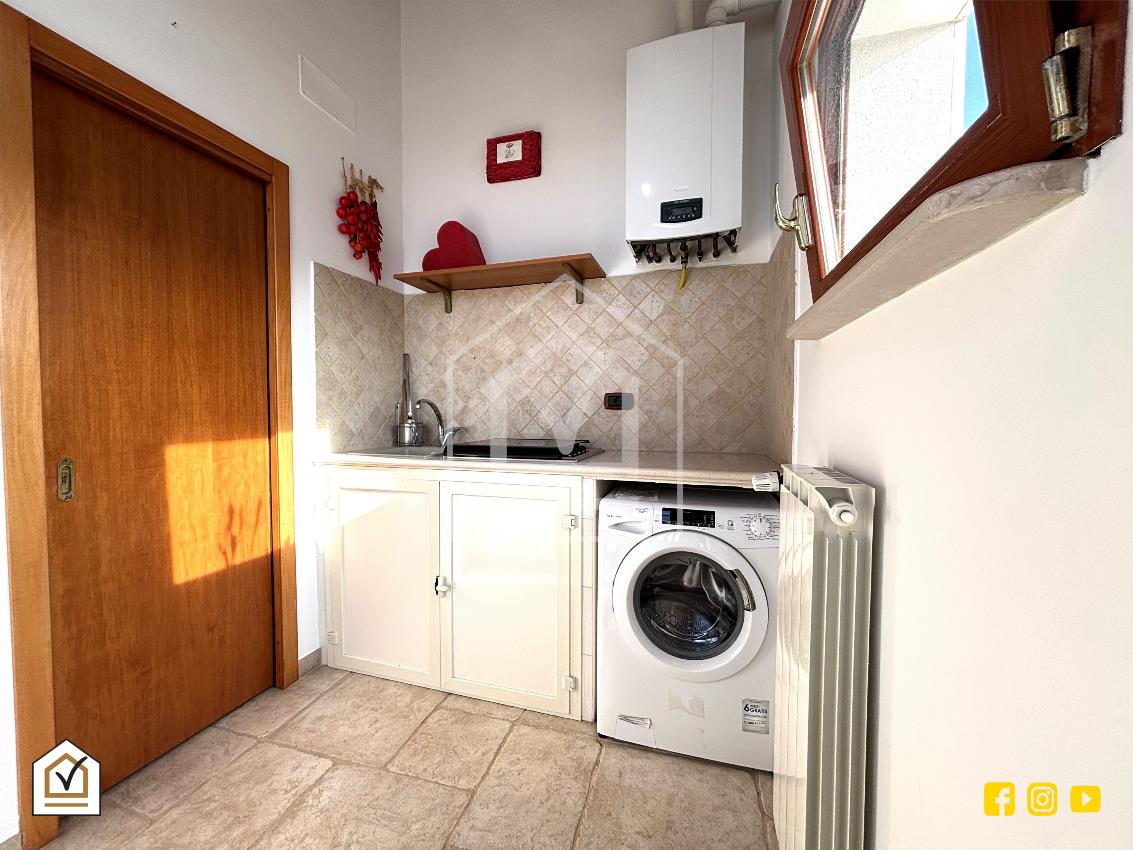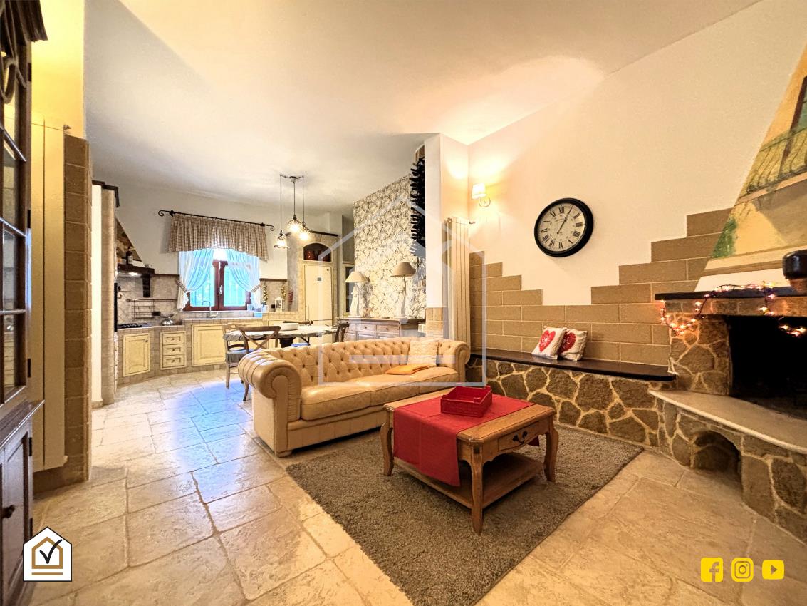L’ingresso conduce in un luminoso salone con caminetto e angolo cottura, dove la pavimentazione in gres effetto chianca dona calore e carattere all’ambiente. La zona giorno è completata da un bagno con box e da un pratico ripostiglio.