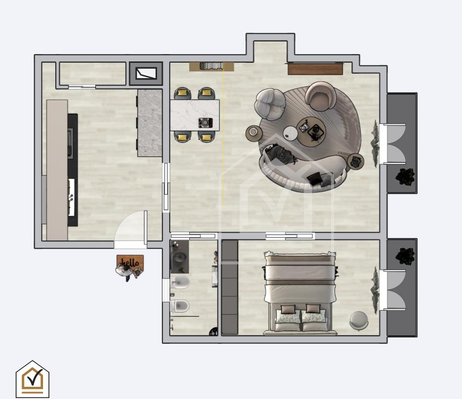 Varcando la porta d'ingresso si è accolti dalla zona giorno con cucinino avente un lucernario con sensore anti-pioggia e zona lavanderia. A destra ampio soggiorno illuminato da balcone con affaccio diretto su strada principale. Da quest'ultimo si accede, tramite due porte separate, alla camera da letto matrimoniale, anch'esso con balcone, e bagno finestrato.