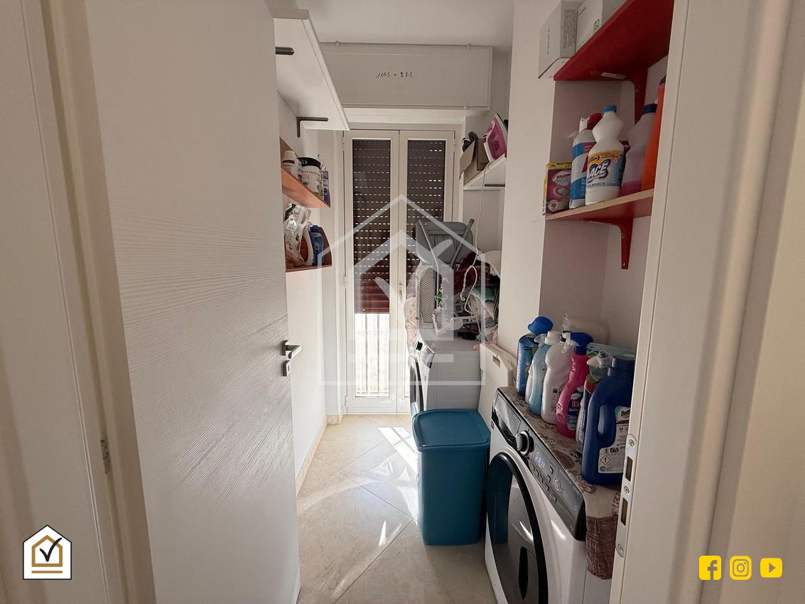 Completano la distribuzione interna una zona lavanderia, utile anche come ripostiglio, e un secondo bagno, anch’esso rinnovato.