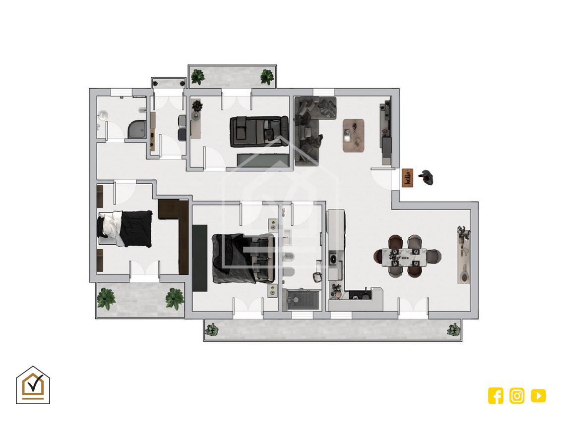 L’ingresso si apre su un ampio open space accogliente e funzionale, con bagno ristrutturato dotato di elegante box doccia in cristallo. Dal disimpegno si accede alla zona notte, composta da tre comode camere da letto, tutte con accesso diretto al balcone, a garantire luce e sfogo esterno a ogni ambiente.