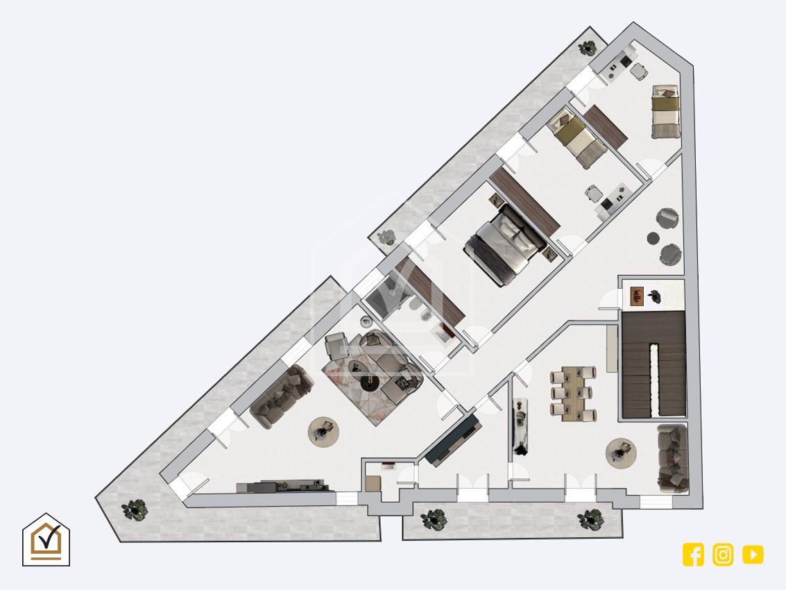 La planimetria, ben distribuita su tutto il piano dell’edificio, consente di sfruttare al meglio i circa 185 mq interni. Grazie alla tripla esposizione, ogni ambiente gode di un’eccellente luminosità naturale durante tutto l’arco della giornata. Gli spazi ampi e regolari permettono inoltre grande libertà progettuale, rendendo possibile qualsiasi soluzione abitativa, dalla più tradizionale alla più contemporanea.
