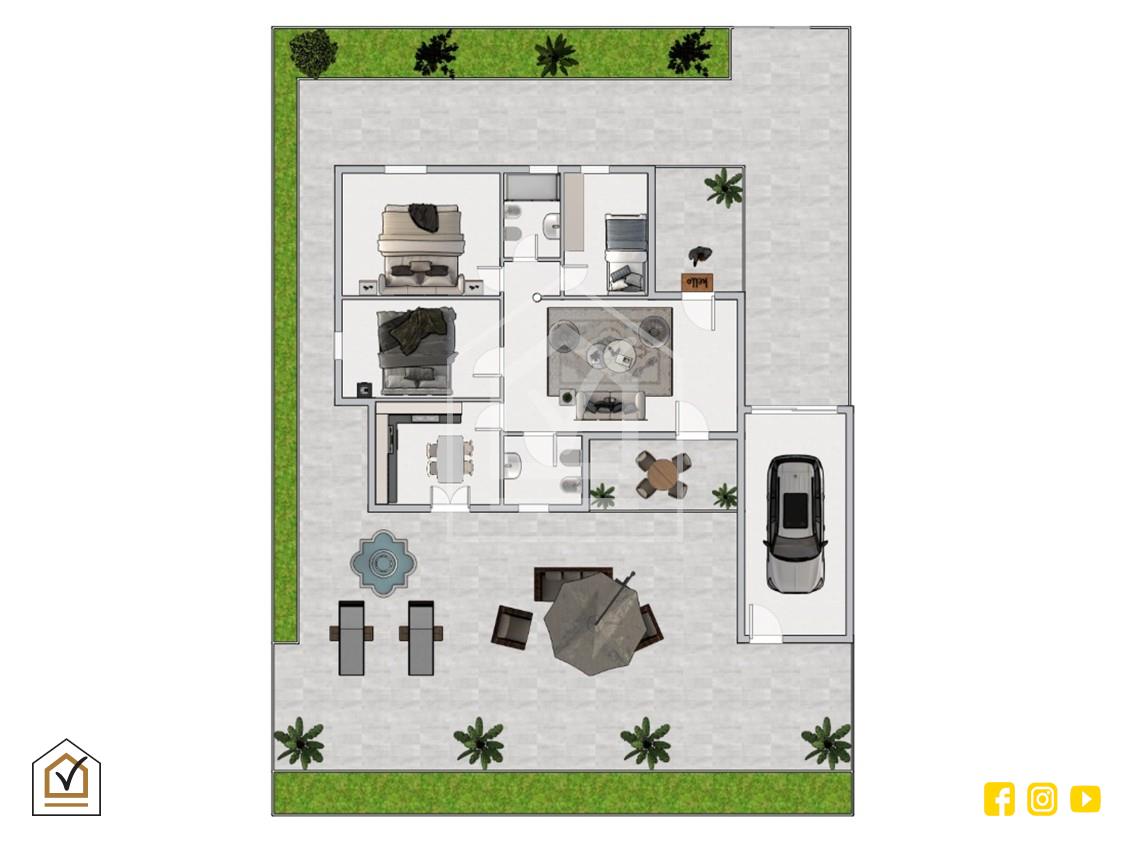 L’abitazione, di circa 90 mq interni, accoglie con un ingresso che conduce in un ampio e luminoso salone con affaccio diretto sul patio, spazio ideale per momenti di relax o convivialità all’aperto. La cucina abitabile, dotata di porta finestra, garantisce un pratico collegamento con l’esterno e con il giardino.