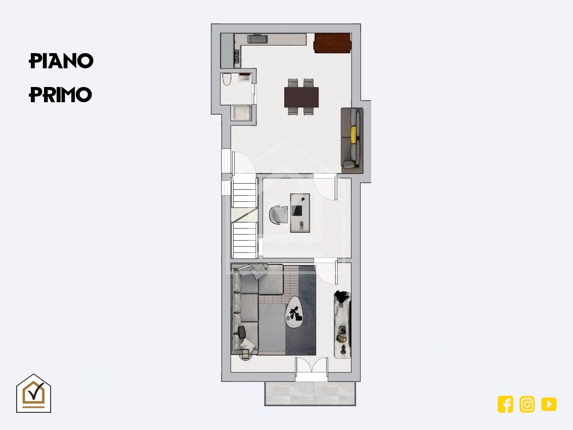 Il primo piano, anch’esso di circa 60 mq, ospita tre ambienti che possono essere ripensati e organizzati al meglio grazie a una distribuzione interna razionale e armoniosa, studiata per offrire comfort, funzionalità e continuità tra gli spazi.