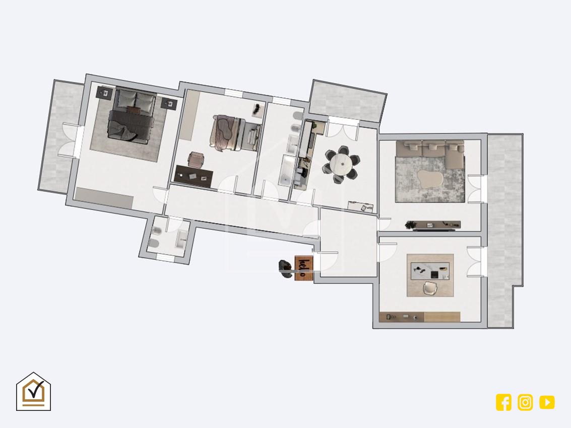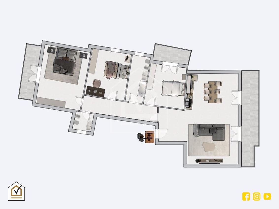L'unità abitativa sviluppa circa 120 mq interni di superficie così composti: ingresso nel disimpegno, cucina abitabile, ampio salone, tre camere da letto, bagno e comoda zona lavanderia. Tutte le stanze della casa sono inoltre dotate di finestre e porte finestre che rendono l'ambiente luminoso e molto arieggiato.