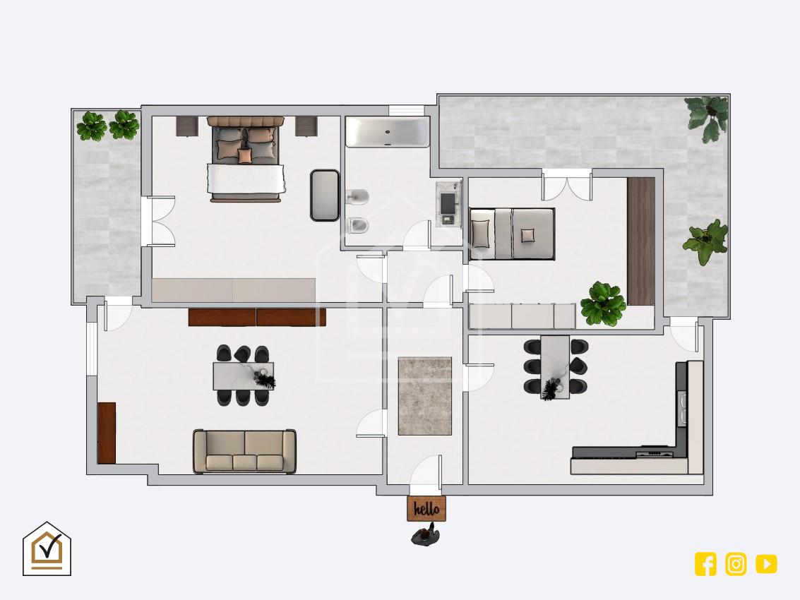 Grazie alla sua planimetria regolare è possibile apportare delle modifiche in base alle necessità; ad esempio è possibile ricreare un ampio e moderno open space con doppia uscita sull'ampio balcone.