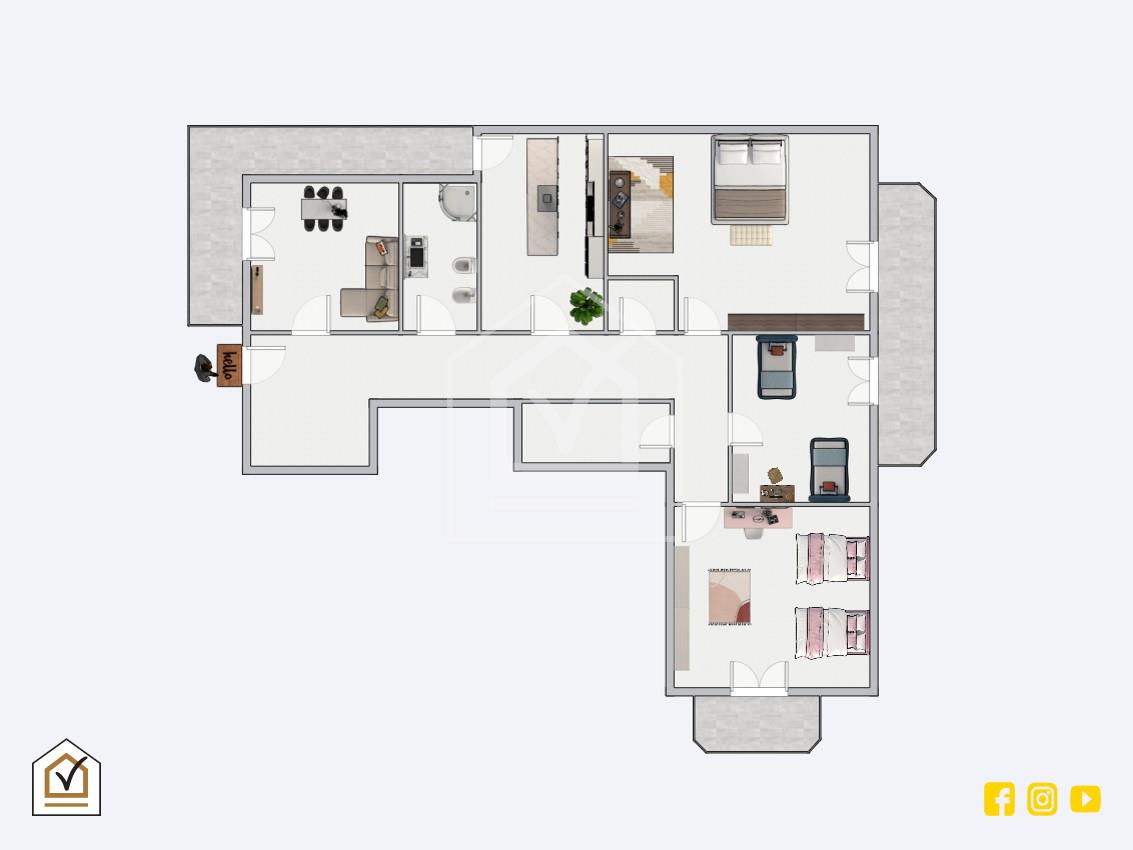 Si sviluppa su una superficie di 130 mq ca. Interni; varcando la porta d'ingresso sorge la cucina di confortevoli dimensioni con adiacente una prima camera da letto; entrambe illuminate dal balcone angolare. Proseguendo il disimpegno si giunge alla zona notte composta da ben 4 camere da letto e dal doppio servizio.