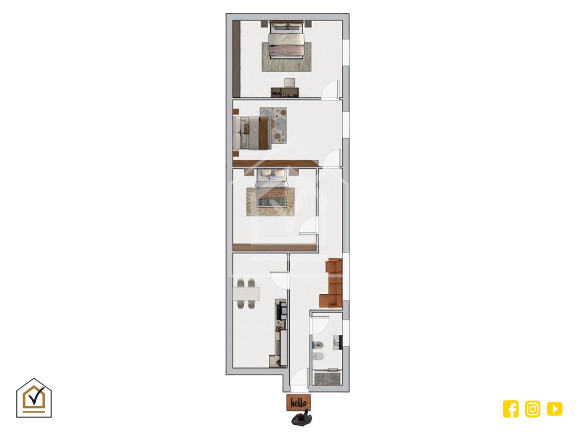 Internamente si compone di tre spaziose camere da letto, tutte dotate di finestre che assicurano una buona luminosità naturale, cucina abitabile con spazio sufficiente e perfetto per l’uso quotidiano ed infine il bagno completo e funzionale.
