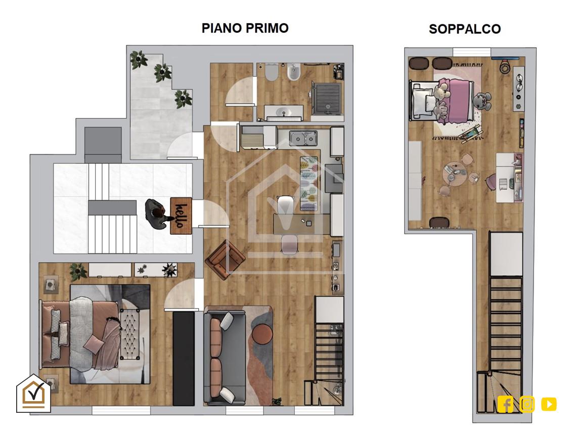 Accanto alla zona giorno prende forma la camera matrimoniale, ampia e ariosa, pensata per garantire comfort e tranquillità. Il bagno, curato nei minimi dettagli, si distingue per i sanitari sospesi, mentre una scala lineare conduce al soppalco che ospita una seconda camera da letto, versatile e personalizzabile, ideale per accogliere ospiti o creare un ambiente indipendente.