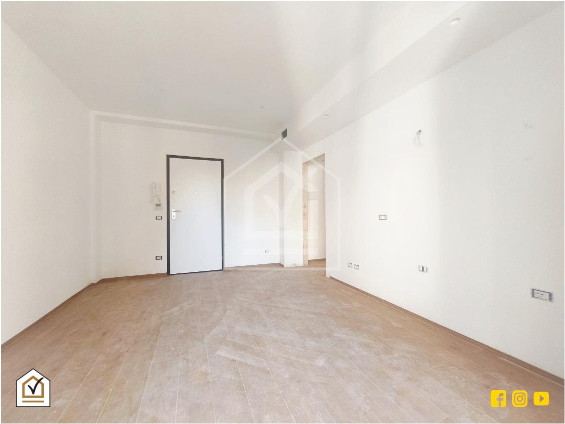 L’appartamento presenta una distribuzione moderna e funzionale. L’ingresso si apre su un ampio soggiorno con angolo cottura, luminoso e dotato di balcone con vano tecnico. Alla sinistra dell’ingresso, un disimpegno conduce alla zona notte, composta da un bagno e da una camera da letto con finestra. L’ambiente è pensato per offrire comfort e praticità.