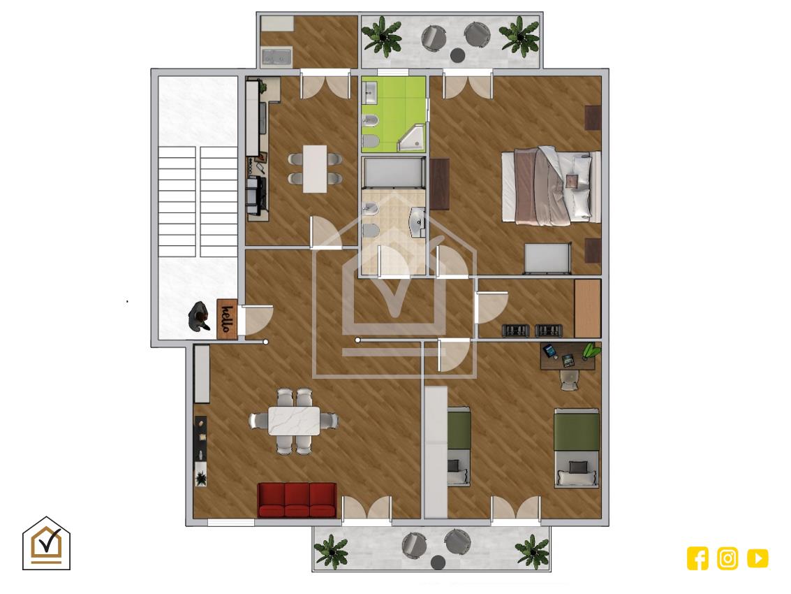 L’abitazione accoglie con un luminoso salone con caminetto, dove i toni caldi del gres effetto legno che riveste l’intera casa esaltano l’atmosfera accogliente e contemporanea. La cucina abitabile si apre su una veranda con cucinino, perfetta per godere di uno spazio funzionale e vivibile in ogni stagione.