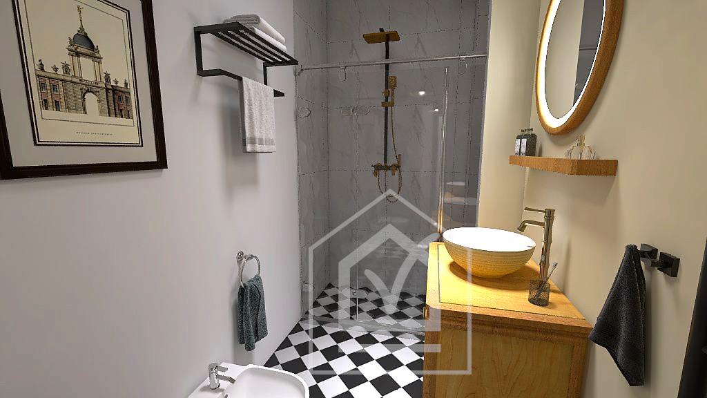 - Sanitari: Linea sospesa Round Mia di Vitra, piatti doccia a profilo ridotto (5 cm) con rubinetteria a incasso, soffione e doccetta;