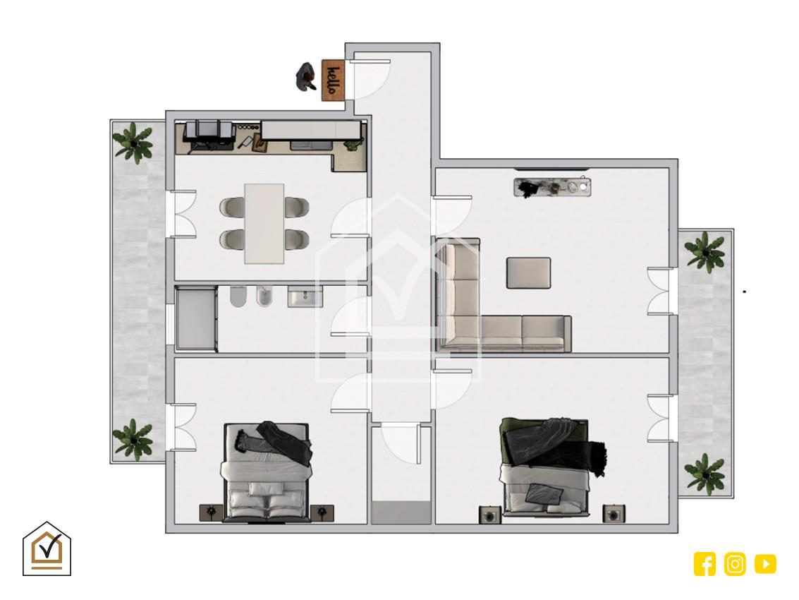 Sulla sinistra troviamo un luminoso salone con affaccio su balcone, mentre sulla destra è presente una cucina abitabile, anch’essa ariosa e ben illuminata dotata di porta finestra con accesso al balcone.