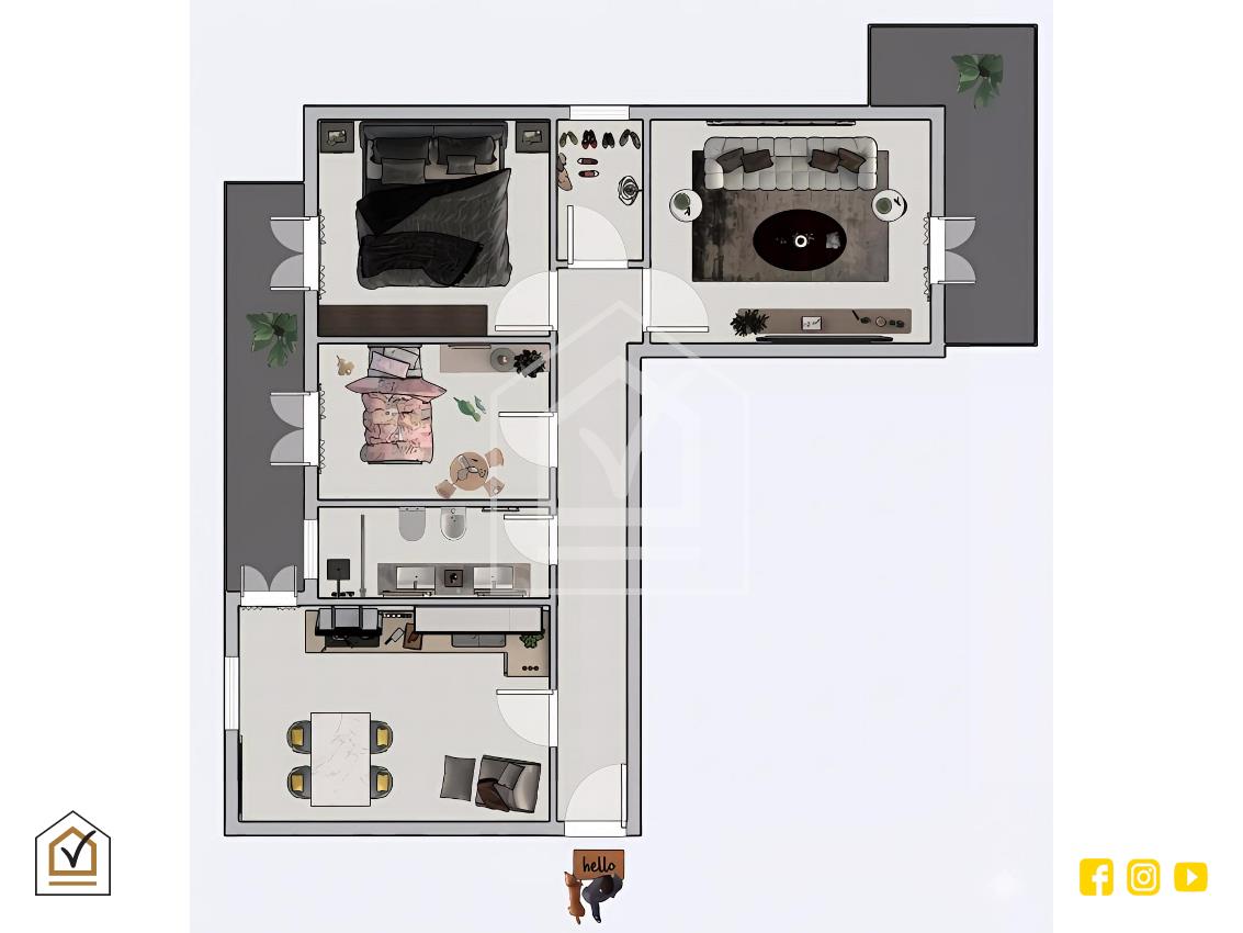 L'ingresso si apre su un ampio corridoio che ospita tutte le camere. A sinistra troviamo una cucina abitabile con doppia finestra, di cui una che accede direttamente al balcone, segue un ampio bagno finestrato con sanitari a pavimento e box doccia. Proseguendo, sempre sulla sinstra, le due camere da letto, di cui una matrimoniale, entrambe che affacciano sul balcone interno. A destra del corridoio, ampio soggiorno illuminato dal balcone su strada principale. Per terminare, in fondo al disimpegno, ripostigilio di generosa metratura, finestrato.