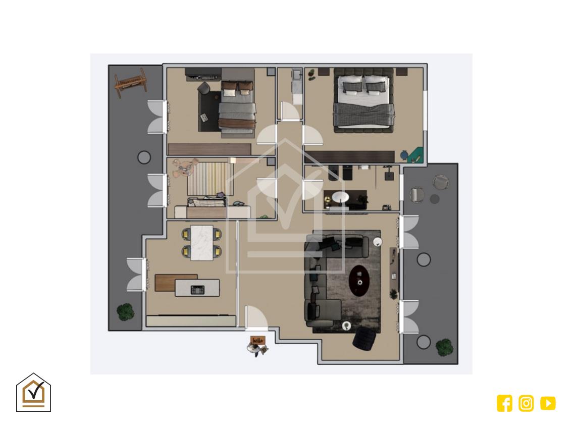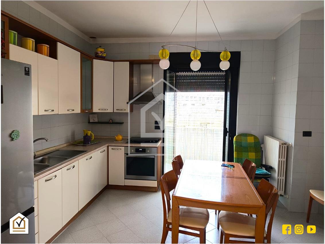 L'appartamento si apre su un'ampia zona living composta da salone con doppia finestra, che permette l'accesso all'esterno con affaccio verso ovest, e cucina abitabile con affaccio verso est. Segue la zona notte con tre camere da letto, di cui una matrimoniale con finestra, e due camerette con affaccio sul balcone. Per completare, bagno finestrato con sanitari a pavimento e ripostiglio.